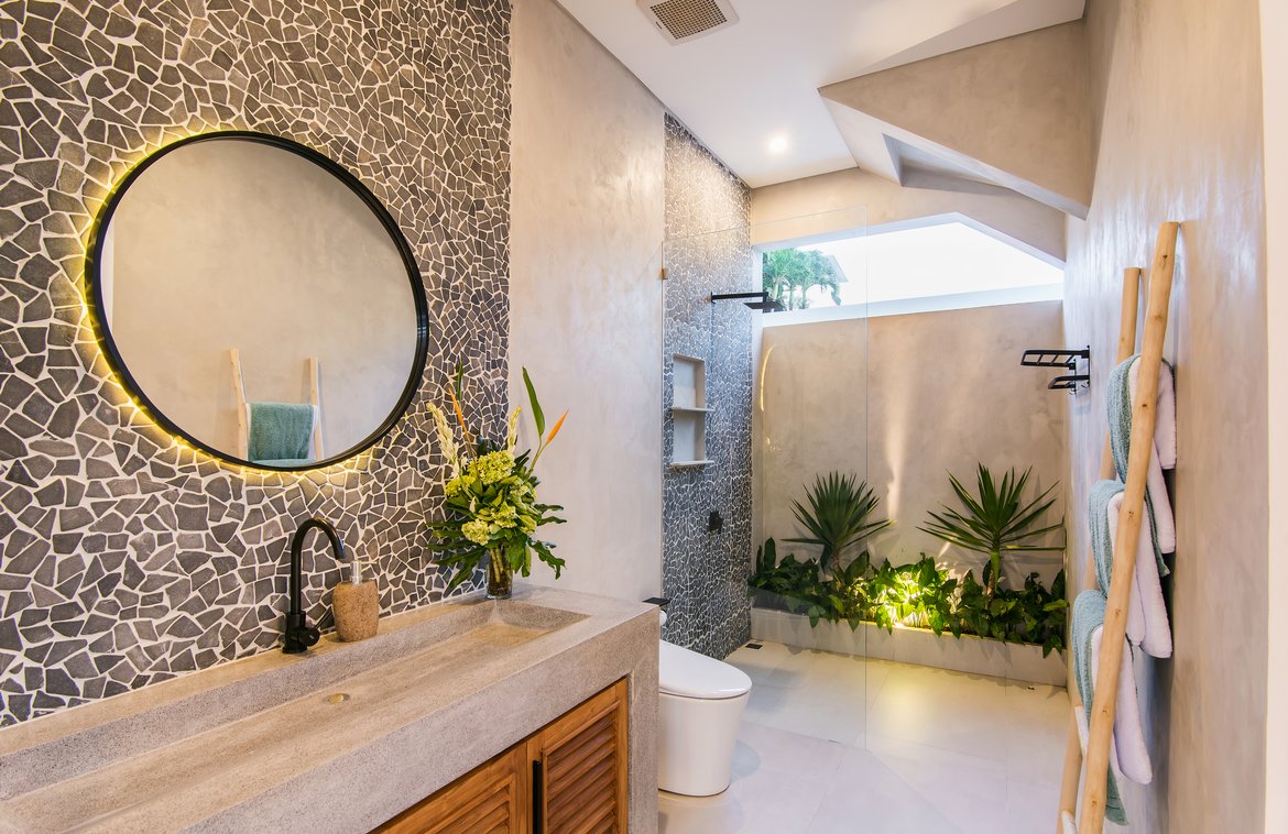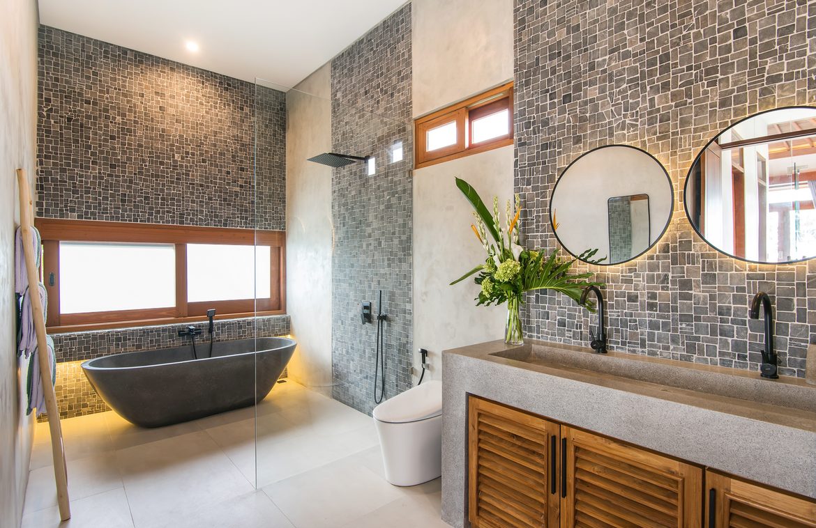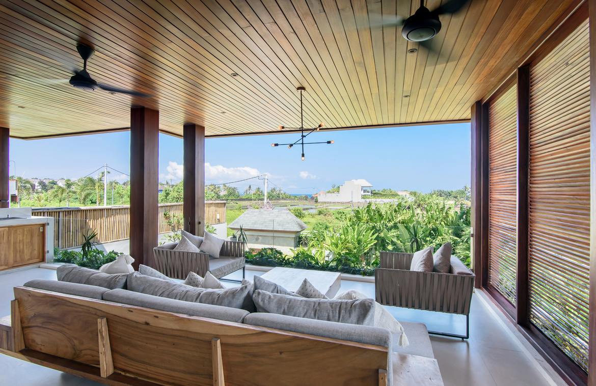 Upstairs, there are two additional bedrooms sharing a stylish bathroom, highlighted by a freestanding bathtub positioned beside a window to enjoy the surrounding views. A large terrace with comfortable seating overlooks the pool, rice fields, and ocean, creating an inviting space for relaxation or entertaining. This level also includes a pantry area, ideal for hosting intimate family gatherings. Warm wood and rattan finishes on the upper floor ceilings add natural texture and character, enhancing the villa’s modern tropical design.