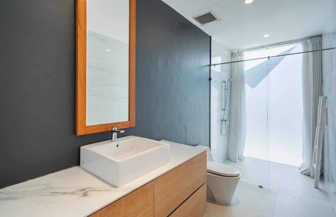 Adjacent is a fully equipped kitchen complete with a pantry. The right wing of the villa hosts two bedrooms, including the master suite, which features a private terrace, walk-in wardrobe, and a luxurious bathroom with a freestanding bathtub. The second bedroom is complemented by a private study. On the left wing, two additional bedrooms each enjoy their own terraces and en-suite bathrooms, with one showcasing a unique semi-open design.