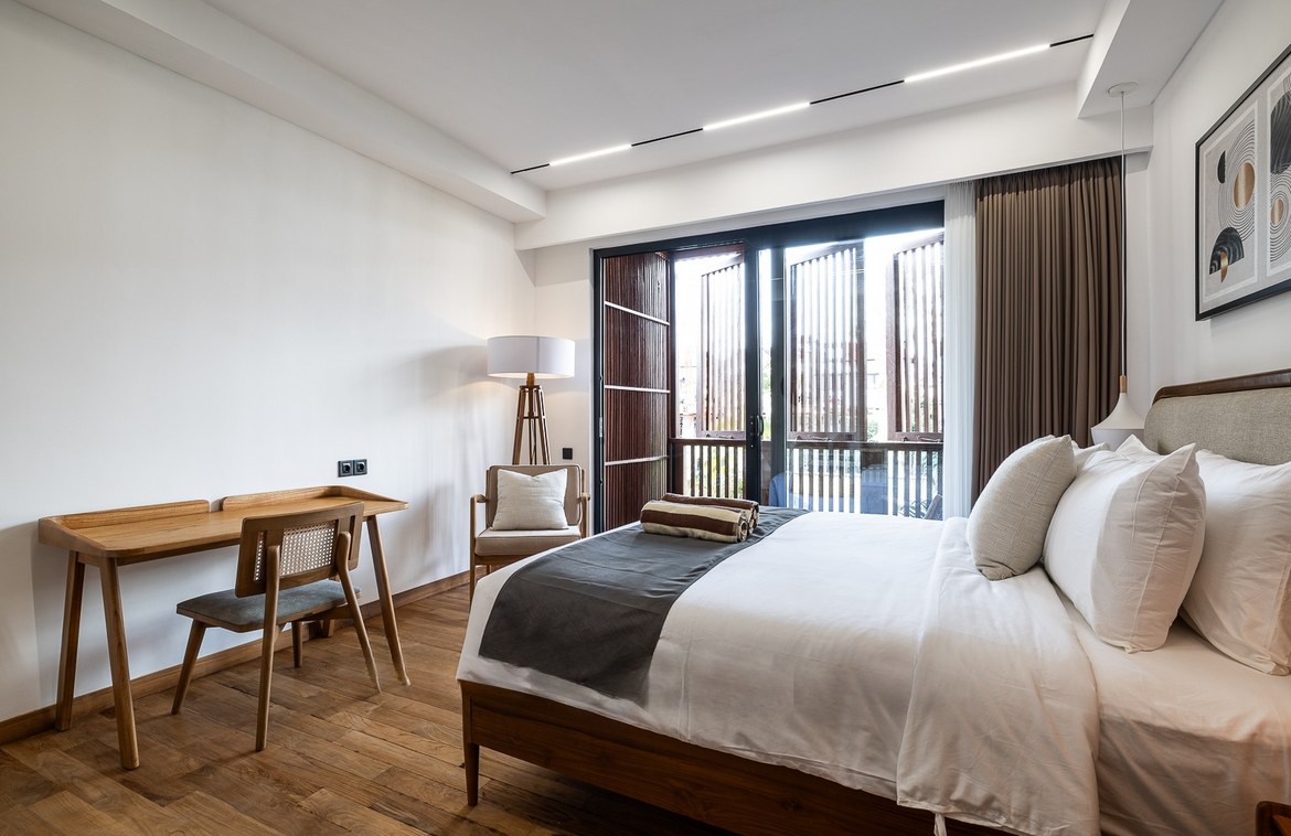 Upstairs, two additional bedrooms await — both generously sized and equipped with working desk, private en-suite bathrooms, and serene balconies. A spacious upper terrace provides an inviting outdoor lounge area furnished for relaxation.