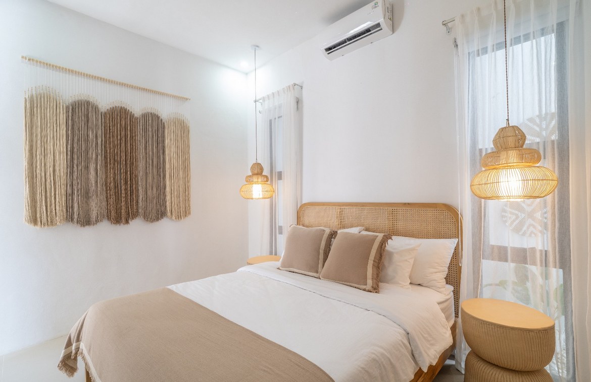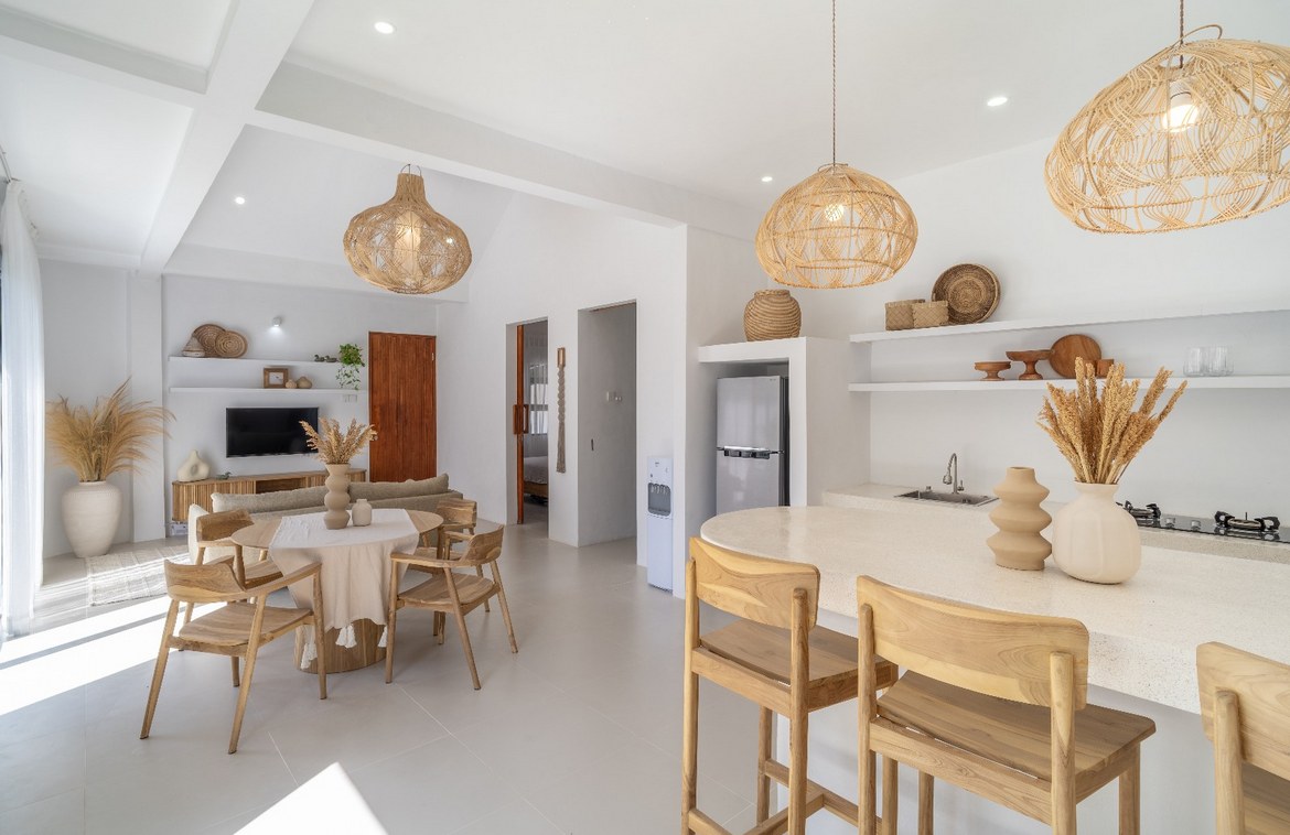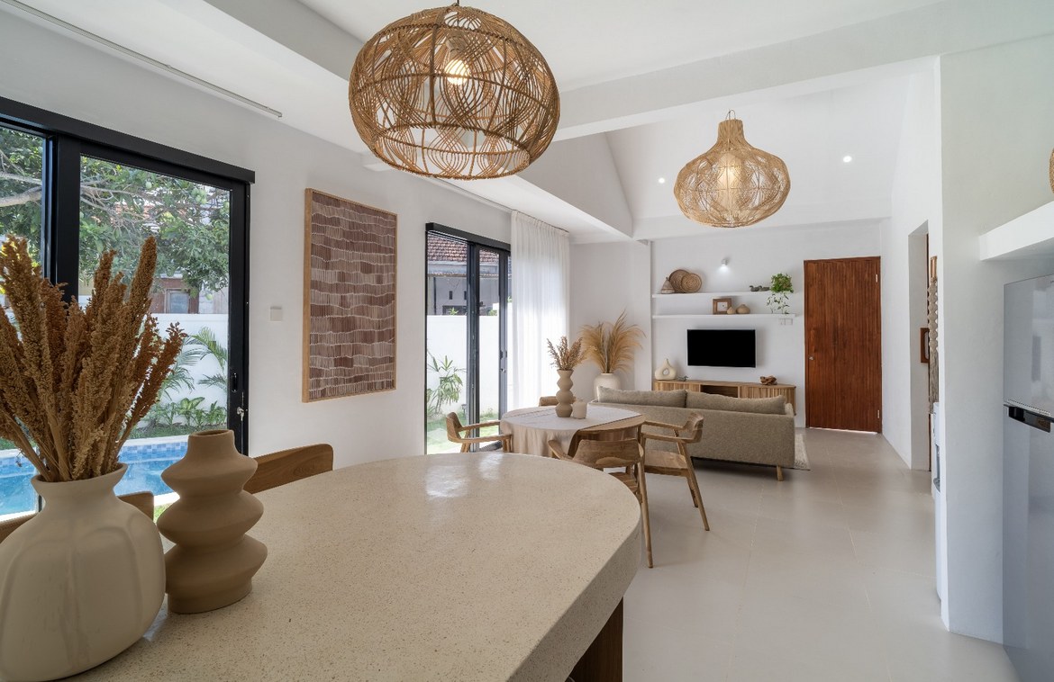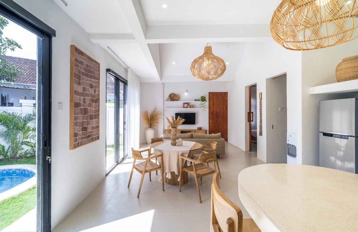 The villa features an open-plan living and dining area with a functional modern kitchen, all overlooking a free-form swimming pool framed by a lush garden. Both bedrooms are accessed from the main living area, filled with natural light, and each comes with its own en-suite bathroom.