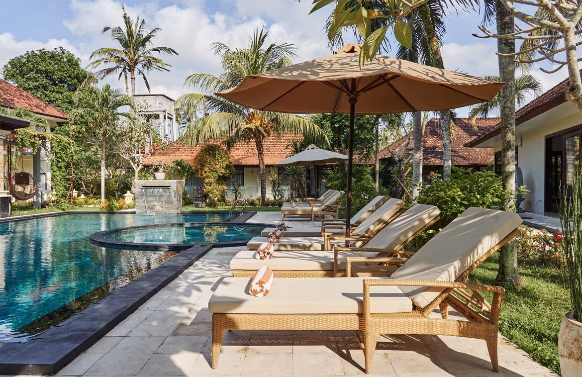 This charming resort is nestled on a 3,100 sqm plot of land, just 550 meters from the beach in Candidasa on Bali's picturesque North East Coast. At the heart of the property lies a 100 sqm swimming pool, surrounded by several independent pavilions set amidst a lush Balinese garden, all with direct pool access. The pool features cascading waterfalls, a shallow dipping area, and is complemented by a spacious deck with sunbeds for relaxation.