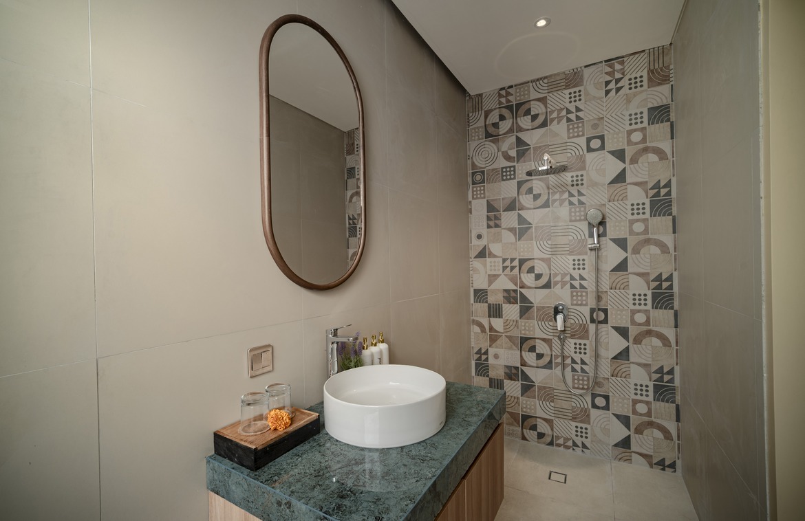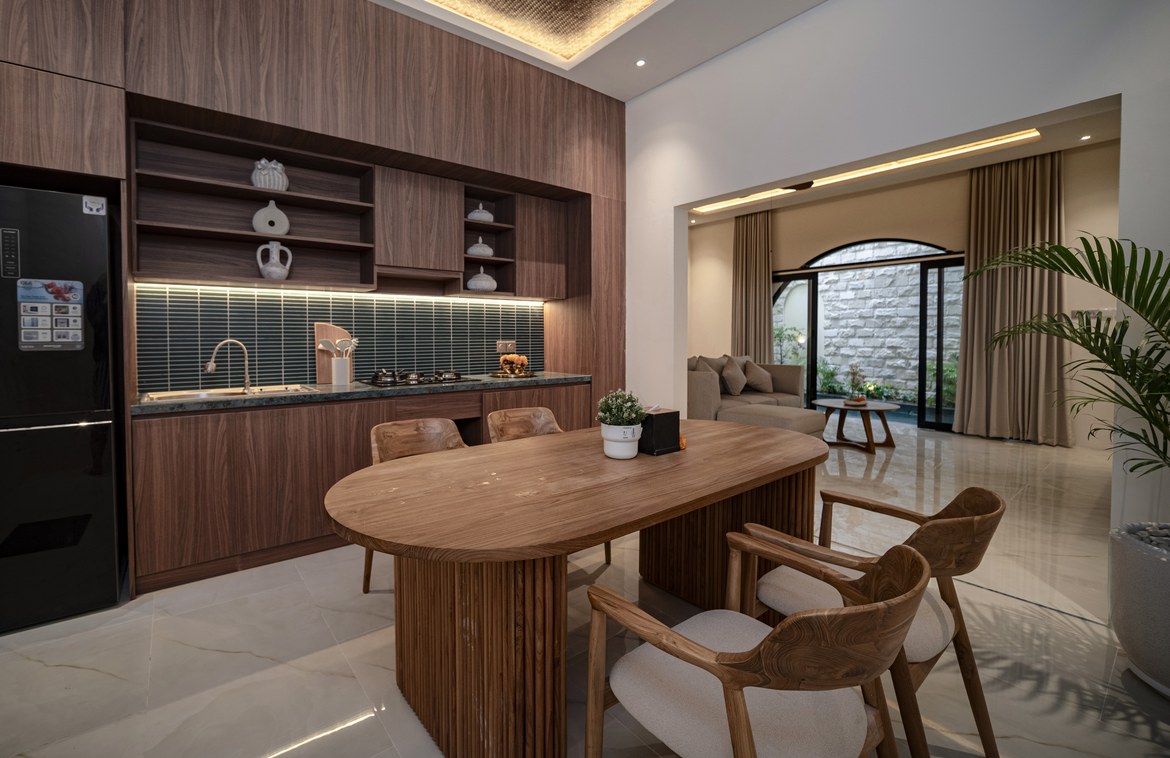 The indoor lounge seamlessly flows towards a uniquely-shaped free-form swimming pool, while the modern kitchen and dining area are conveniently situated behind the living space. Upstairs, you'll find two en-suite bedrooms with access to a share balcony. The master bathroom is elegantly appointed with a luxurious bathtub.