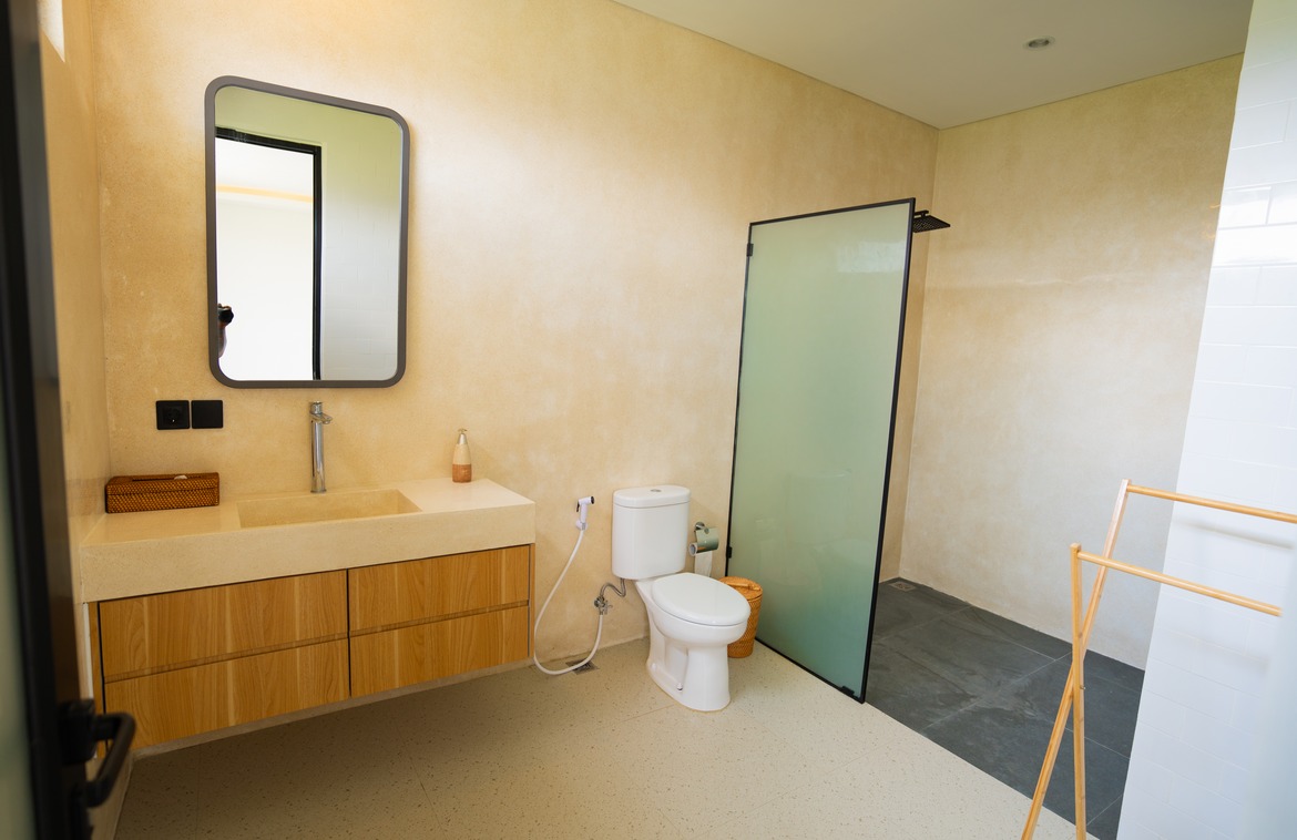 Set on 167 sqm of land and spread over two levels, the villa features an open-plan living and dining area on the ground floor, seamlessly connected to a modern kitchen. Expansive sliding glass doors open to a pristine swimming pool, a neatly landscaped lawn, and two sunbeds — the perfect spot to unwind with soothing rice field views. Also on this level, the first bedroom enjoys a view of the pool and rice fields, complete with its own en-suite bathroom.