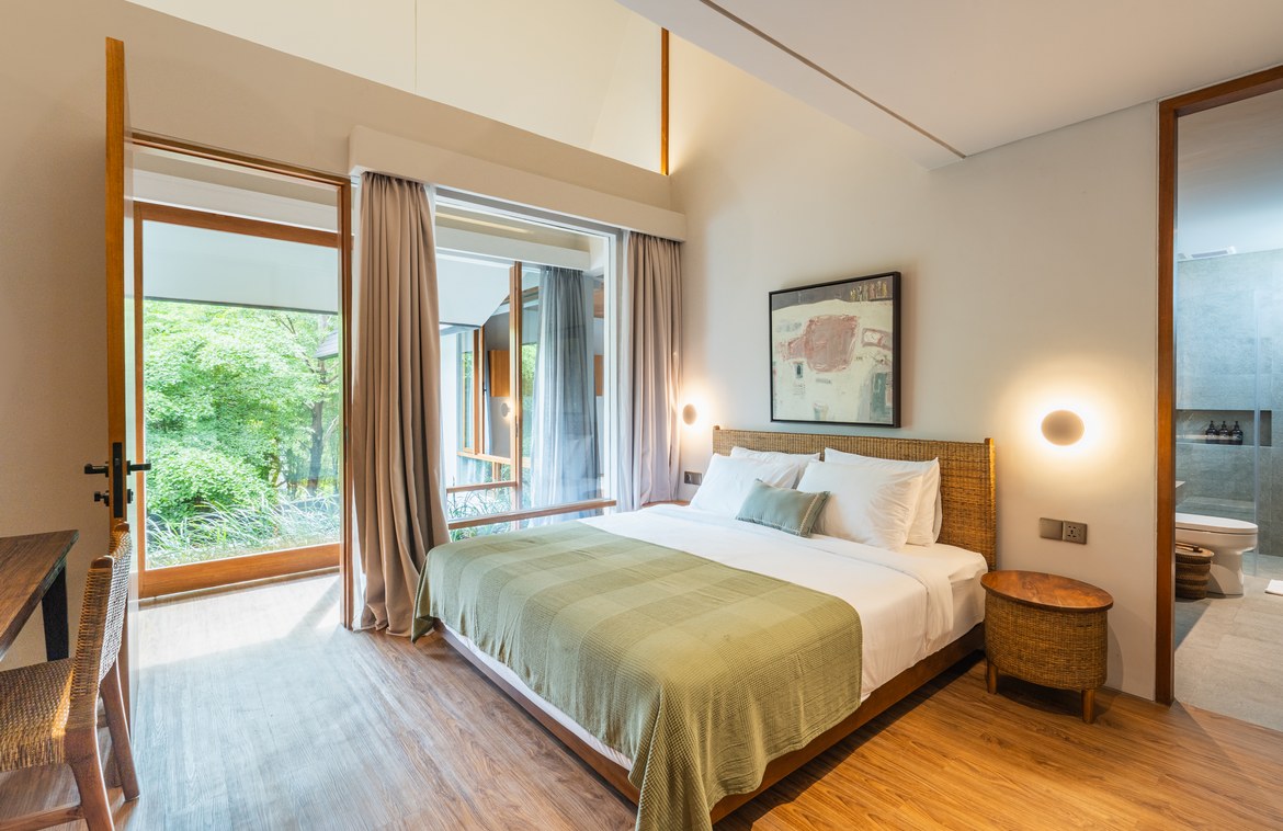 On the ground floor, you'll find an expansive open-plan living and dining area that flows seamlessly into a modern kitchen. The space can be enclosed for air-conditioned comfort or opened up with large floor-to-ceiling glass doors, allowing a harmonious connection between the indoor and outdoor areas. The master bedroom, conveniently located adjacent to the living area, faces the pool and boasts a generous size, complete with an en-suite bathroom featuring a luxurious bathtub.