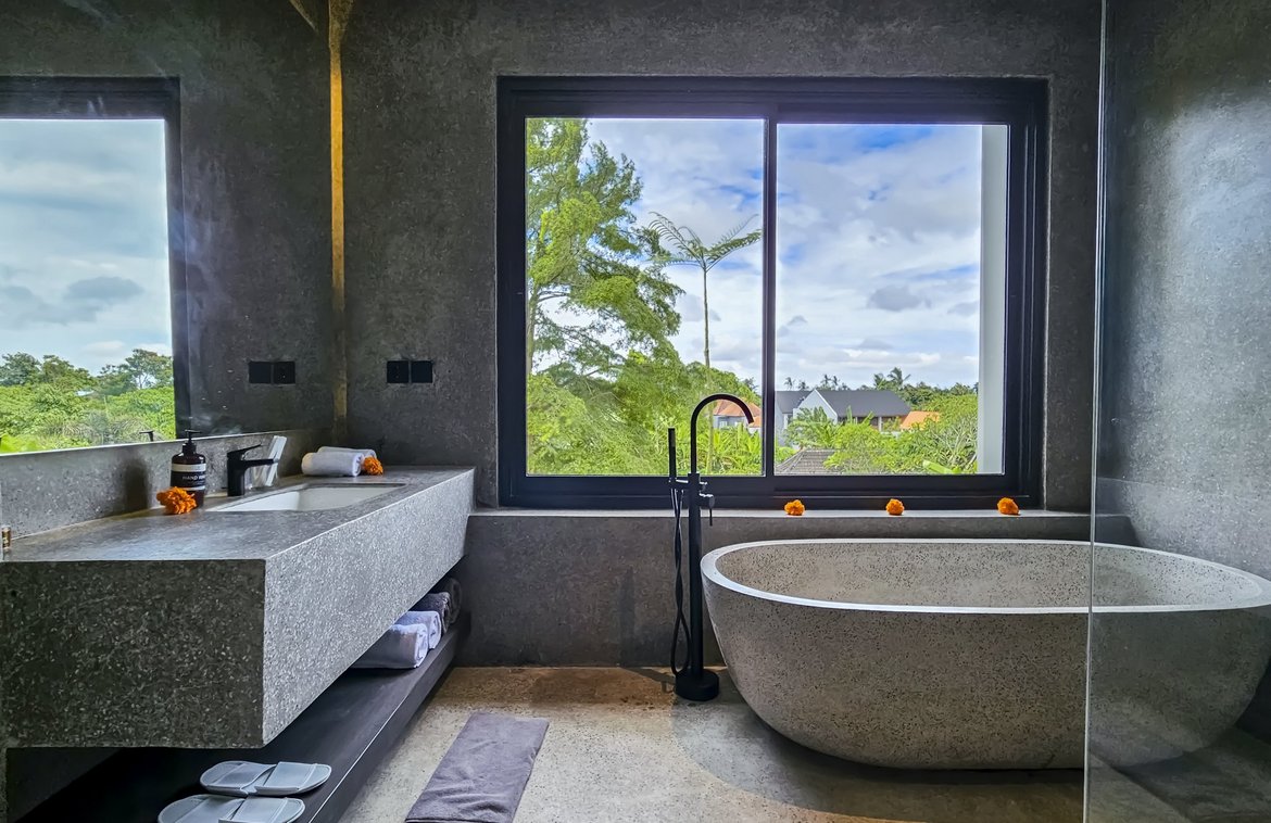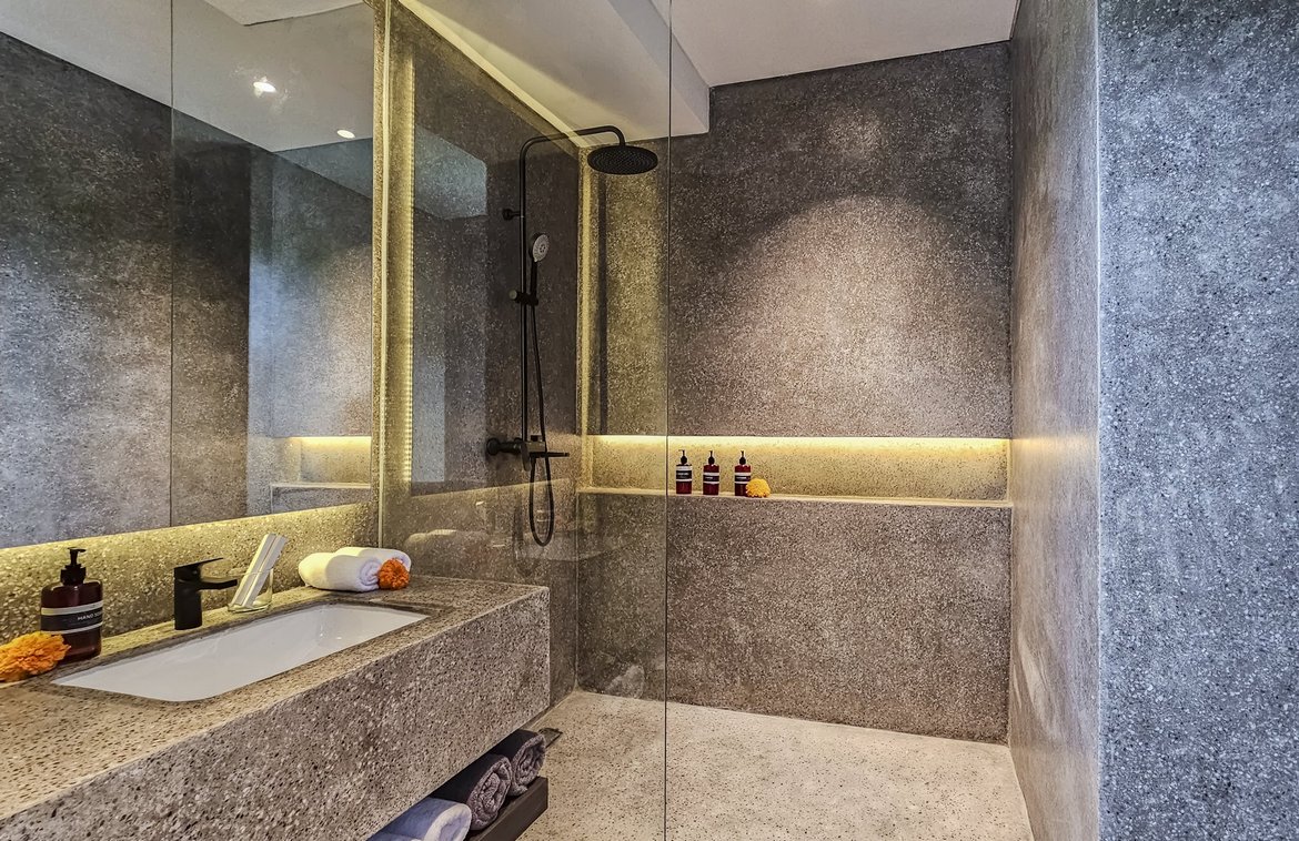 The villa features three well-appointed bedrooms, each filled with natural light and designed with minimalist elegance. Every bedroom includes a built-in wardrobe and an en-suite bathroom. The bathrooms are finished in stylish terrazzo with clean, modern lines that complement the villa’s contemporary design.The master bathroom is particularly striking, highlighted by a beautiful terrazzo bathtub positioned by the window, offering a tranquil space to unwind.