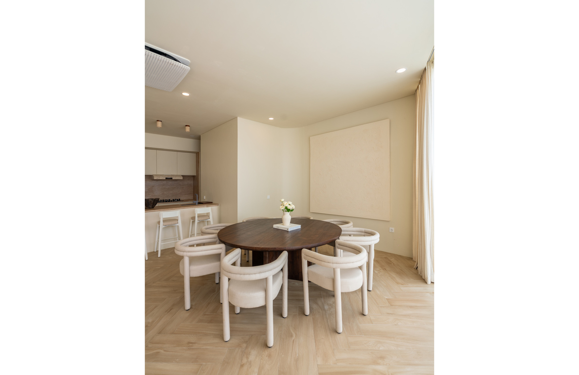 The enclosed living area is both stylish and comfortable, featuring sleek contemporary lines and tasteful finishes that enhance the villa’s modern character. Flowing seamlessly from the lounge is an elegant round dining table for eight, positioned beside a minimalist modern kitchen with a breakfast peninsula—perfect for casual dining and effortless entertaining.