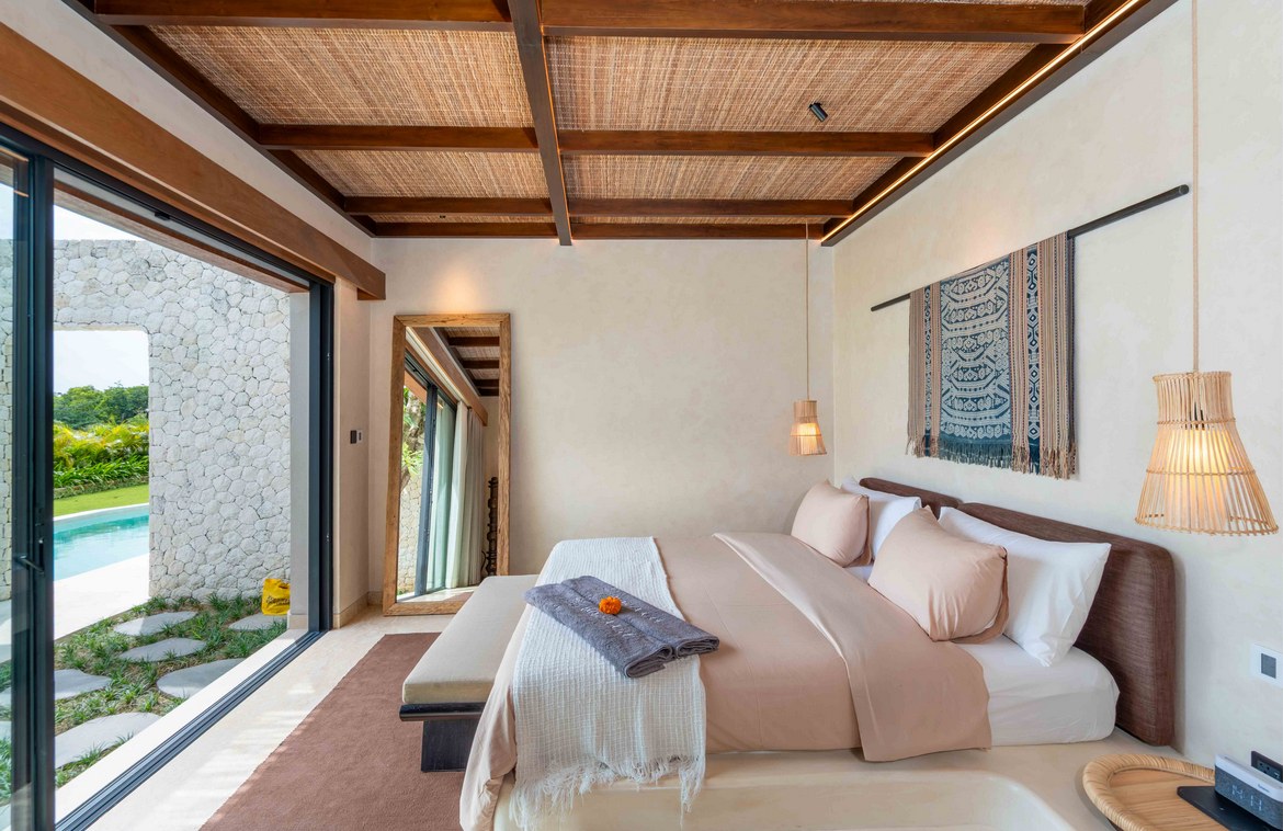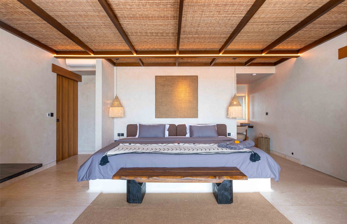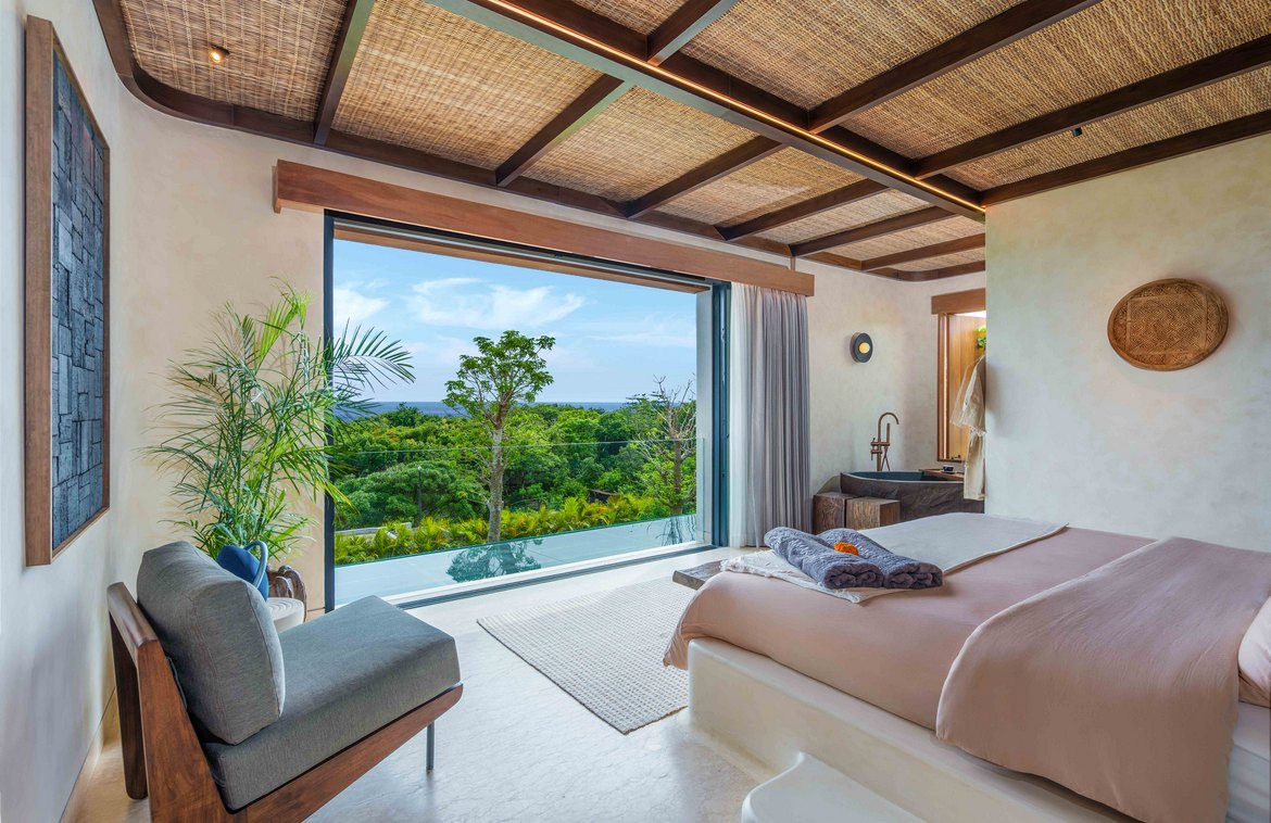 The villa comprises four en-suite bedrooms, each with its own distinctive character and all enjoying views over the pool and out to the ocean beyond. Both floors feature spacious indoor living and dining areas, each complemented by a fully equipped gourmet kitchen designed for effortless, high-end cooking and entertaining.