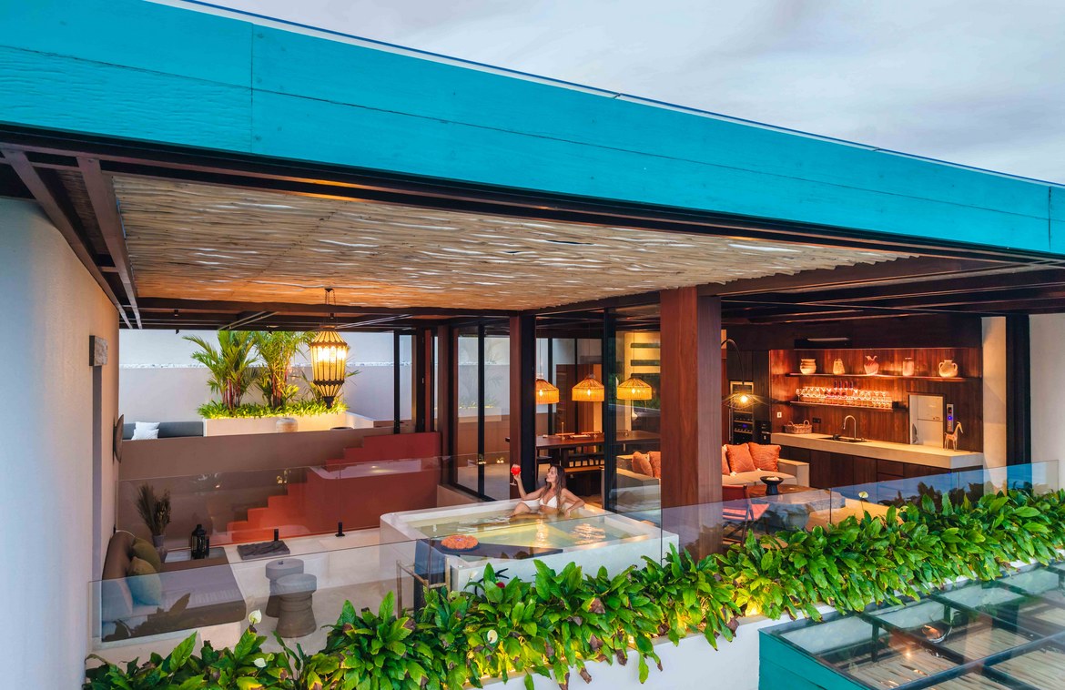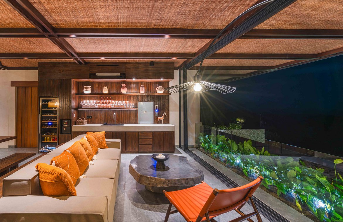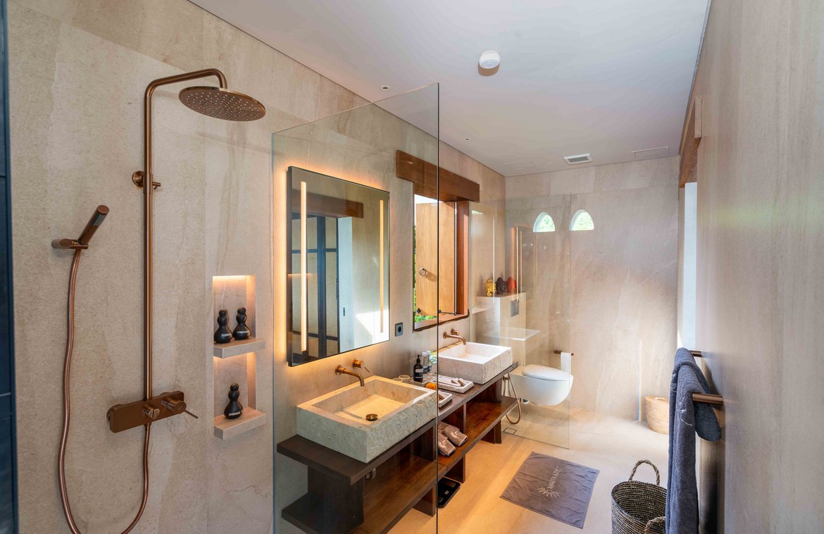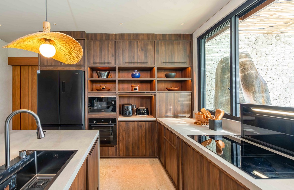 The villa comprises four en-suite bedrooms, each with its own distinctive character and all enjoying views over the pool and out to the ocean beyond. Both floors feature spacious indoor living and dining areas, each complemented by a fully equipped gourmet kitchen designed for effortless, high-end cooking and entertaining.