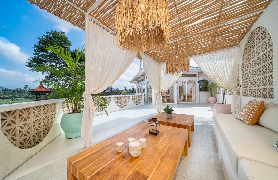 Upstairs, the open-plan living and dining area is housed within a charming Joglo structure and comes fully equipped with air-conditioning. Flanking both sides are expansive terraces, one of which includes a built-in lounge and covered seating area—perfect for enjoying the cooling breeze and uninterrupted rice field views.