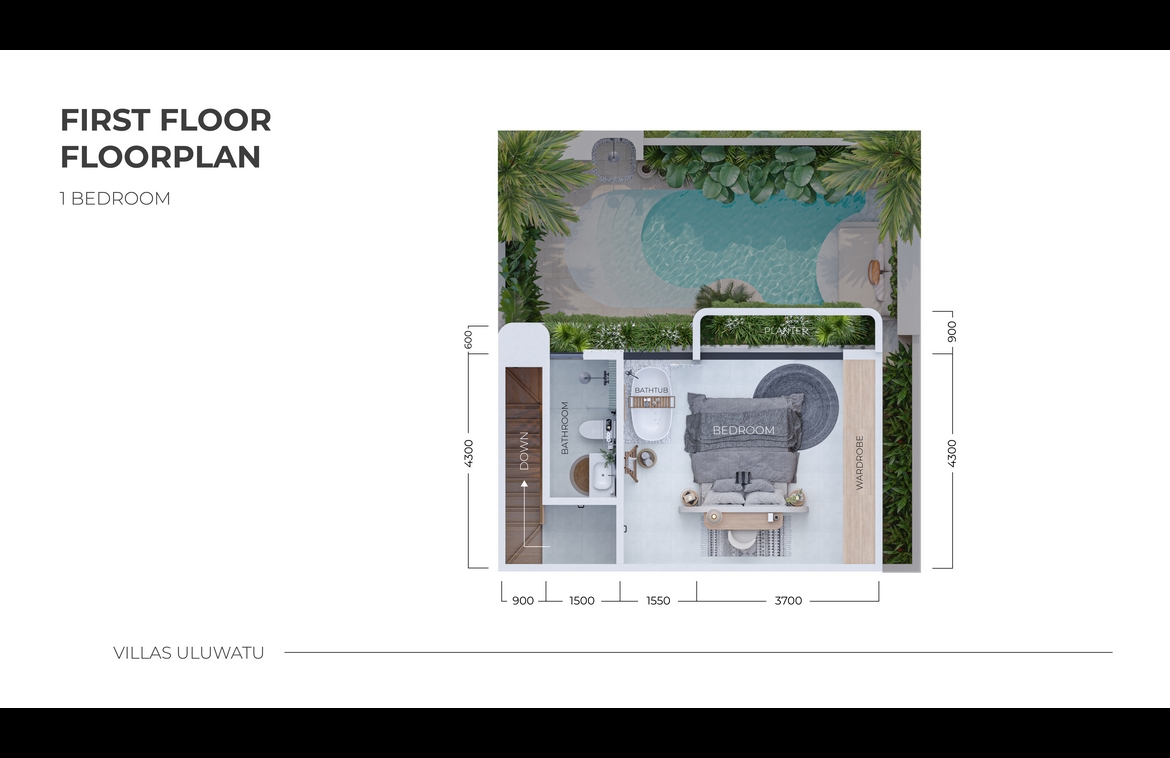 Only one 1-bedroom villa remains. Set on 75 sqm of land with 75 sqm of living space across two levels, this thoughtfully designed residence maximizes both comfort and style. The ground floor features a cozy sunken lounge overlooking the private pool, complemented by a dining area and contemporary kitchen. The pool is framed by lush tropical landscaping, complete with a built-in daybed at one end and an outdoor shower for a true resort ambiance.