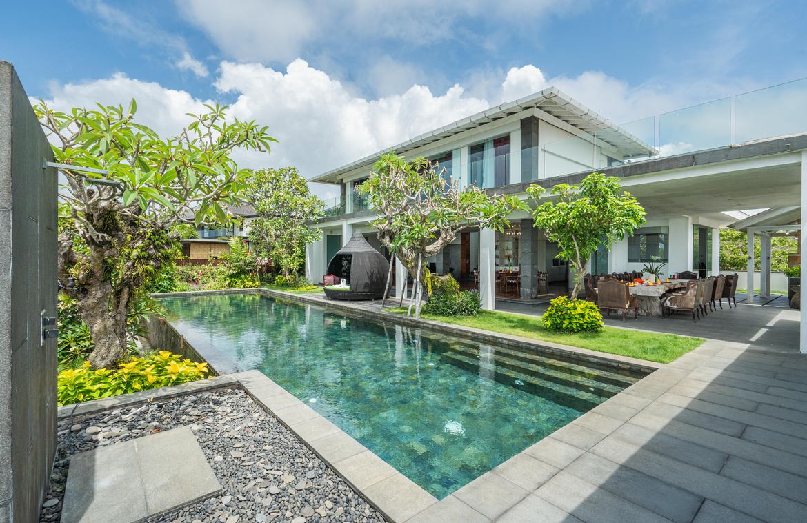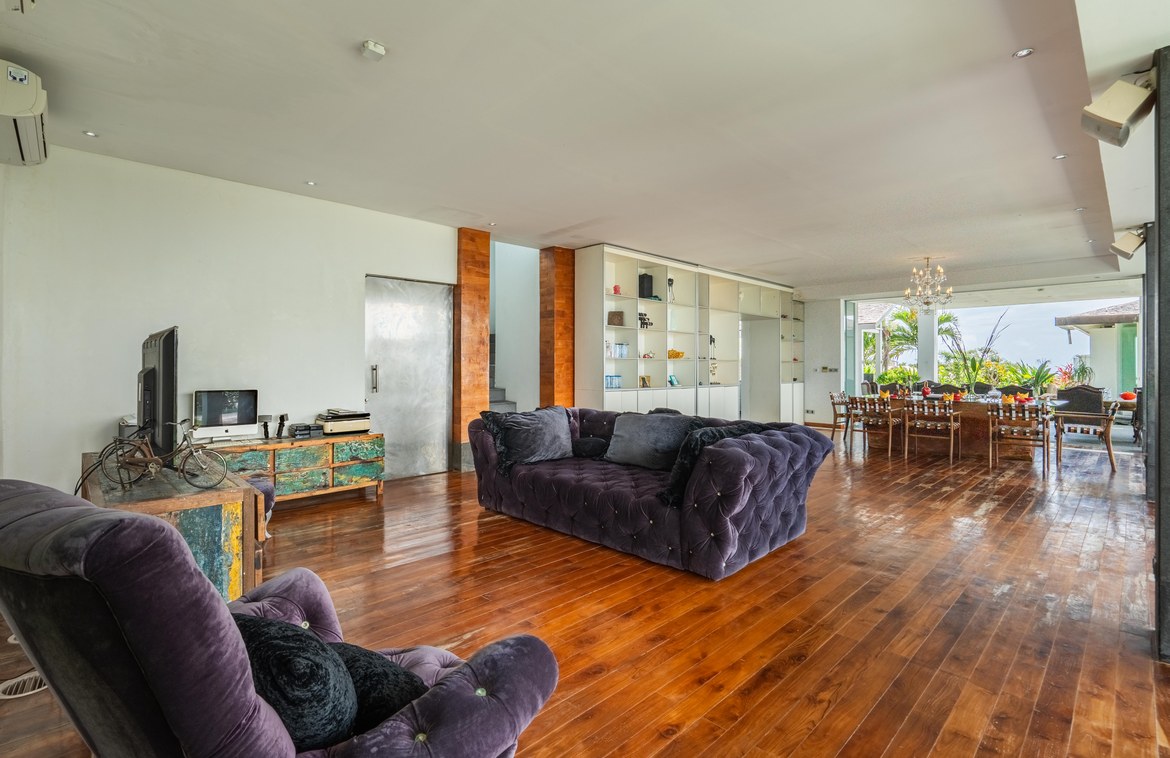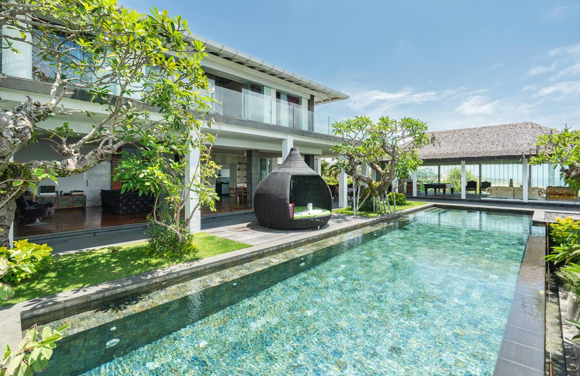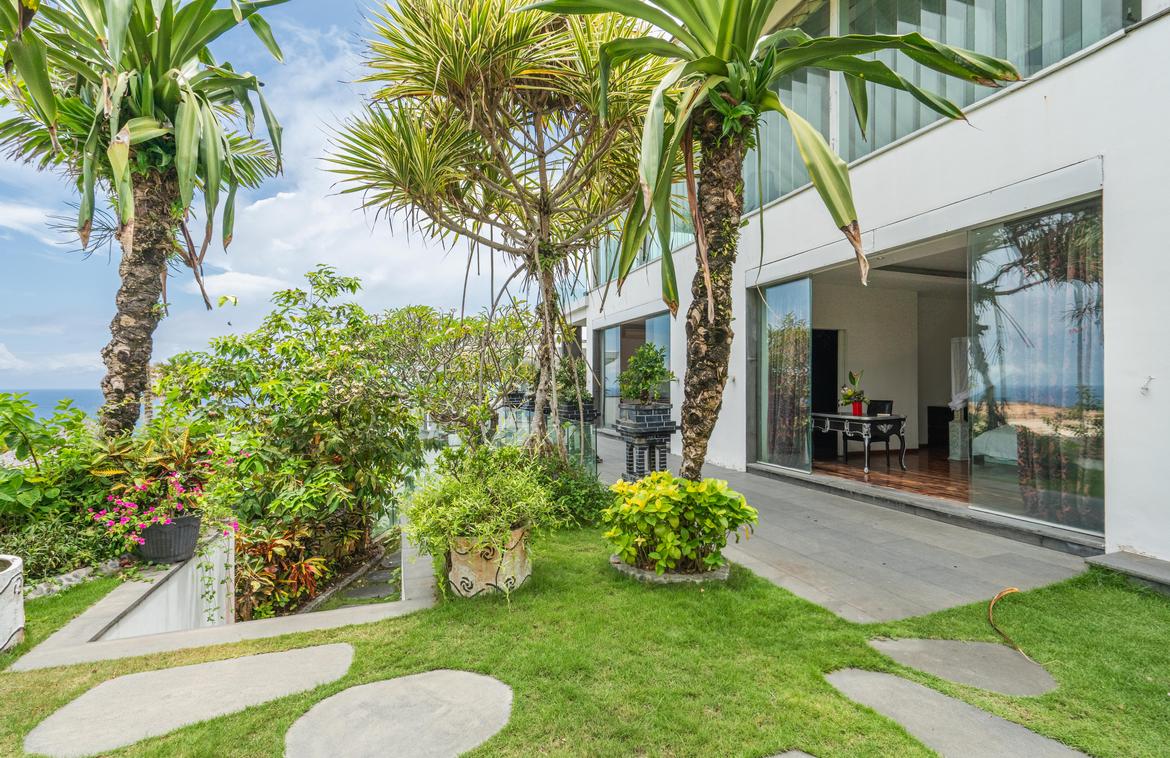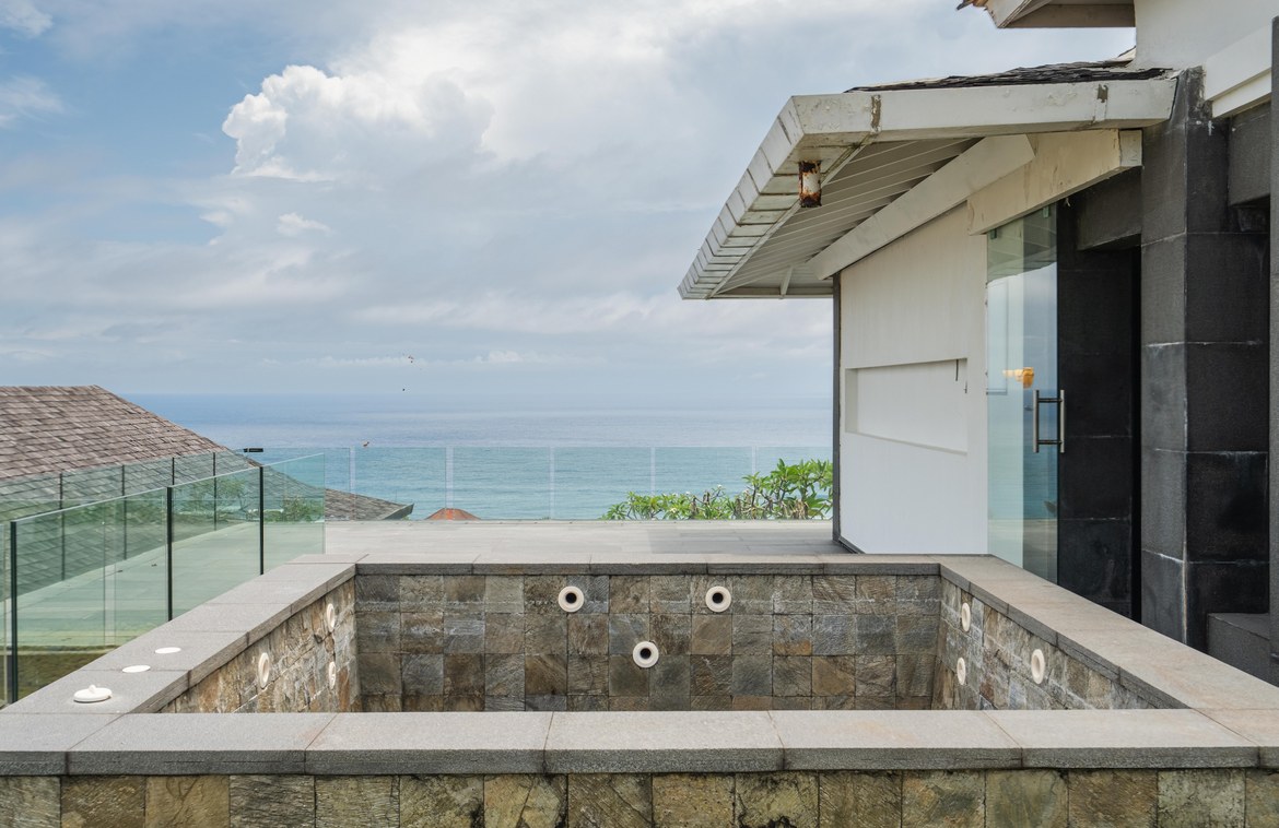 This exquisitely designed villa is nestled within a gated estate on the Bukit Peninsula, mere moments from the pristine Pandawa Beach in South Bali. Encompassing over 1,410 square meters of cliffside land, the villa boasts breathtaking ocean views.Upon entering through an expansive, lush garden, you are greeted by the first two-story building. The lower level features two en-suite bedrooms, a gym, and a sauna. The upper level is dedicated to a spacious living and dining area, complemented by a modern, fully equipped kitchen with a breakfast bar. This space opens onto a covered terrace that stretches along the length of the building. At one end of the terrace, a generously sized open lounge with comfortable sofas provides an ideal spot to relax and take in the magnificent ocean views. At the opposite end, an inviting round overflow pool is perfect for cooling off on hot days while enjoying a cocktail. The pool cascades into a second pool below, with stairs leading to the upper floor of the adjacent building.The upper floor of this second building houses a generous size master bedroom, which opens onto a large terrace featuring a relaxation pavilion. From here, you can enjoy views of the second pool, the lush garden below, and the stunning ocean beyond. The lower level of this building includes a second indoor lounge and dining area, with a modern kitchen that opens onto a pool deck featuring an L-shaped pool. Adjacent to the pool is an open pavilion offers a perfect setting for alfresco dining.The estate also includes staff quarters with four bedrooms and a garage accommodating two cars. This freehold property is offered unfurnished, allowing the fortunate buyer the opportunity to personalize and elevate this estate into a luxurious paradise with a touch of their own style.