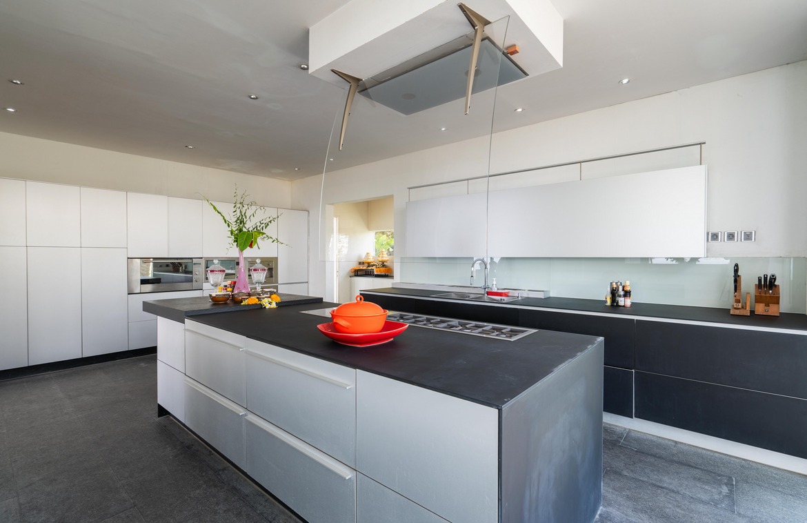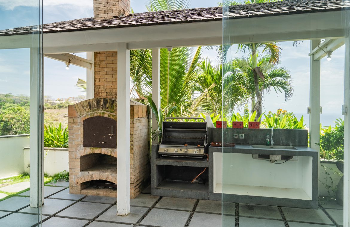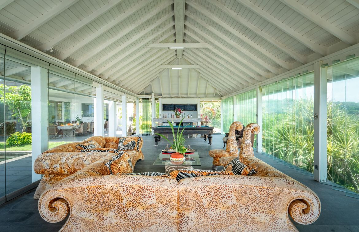 The upper floor of this second building houses a generous size master bedroom, which opens onto a large terrace featuring a relaxation pavilion. From here, you can enjoy views of the second pool, the lush garden below, and the stunning ocean beyond. The lower level of this building includes a second indoor lounge and dining area, with a modern kitchen that opens onto a pool deck featuring an L-shaped pool. Adjacent to the pool is an open pavilion offers a perfect setting for alfresco dining.