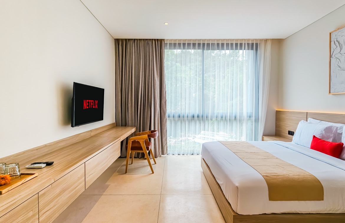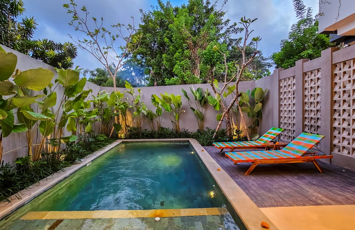 Cleverly positioned on 140 sqm of land in Ungasan, this brand-new villa offers 180 sqm of living space across two levels, overlooking a 6.4 x 3 m swimming pool framed by tropical landscaping. A wooden deck with two sun loungers sits beside the pool, creating a relaxing outdoor retreat.
