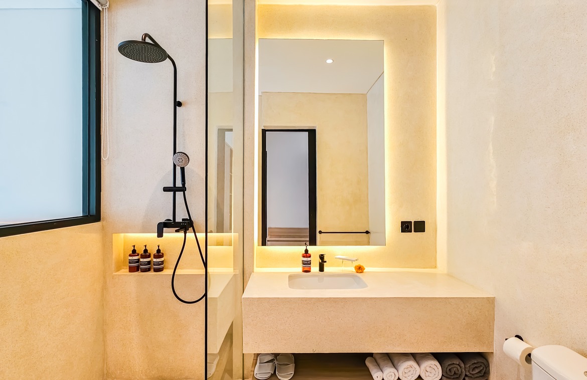 Both bedrooms are generously sized and come with built-in wardrobes and stylish en-suite bathrooms finished in white cement for a clean, contemporary look. The master bathroom is enhanced with a freestanding bathtub positioned by the window, adding a touch of luxury.
