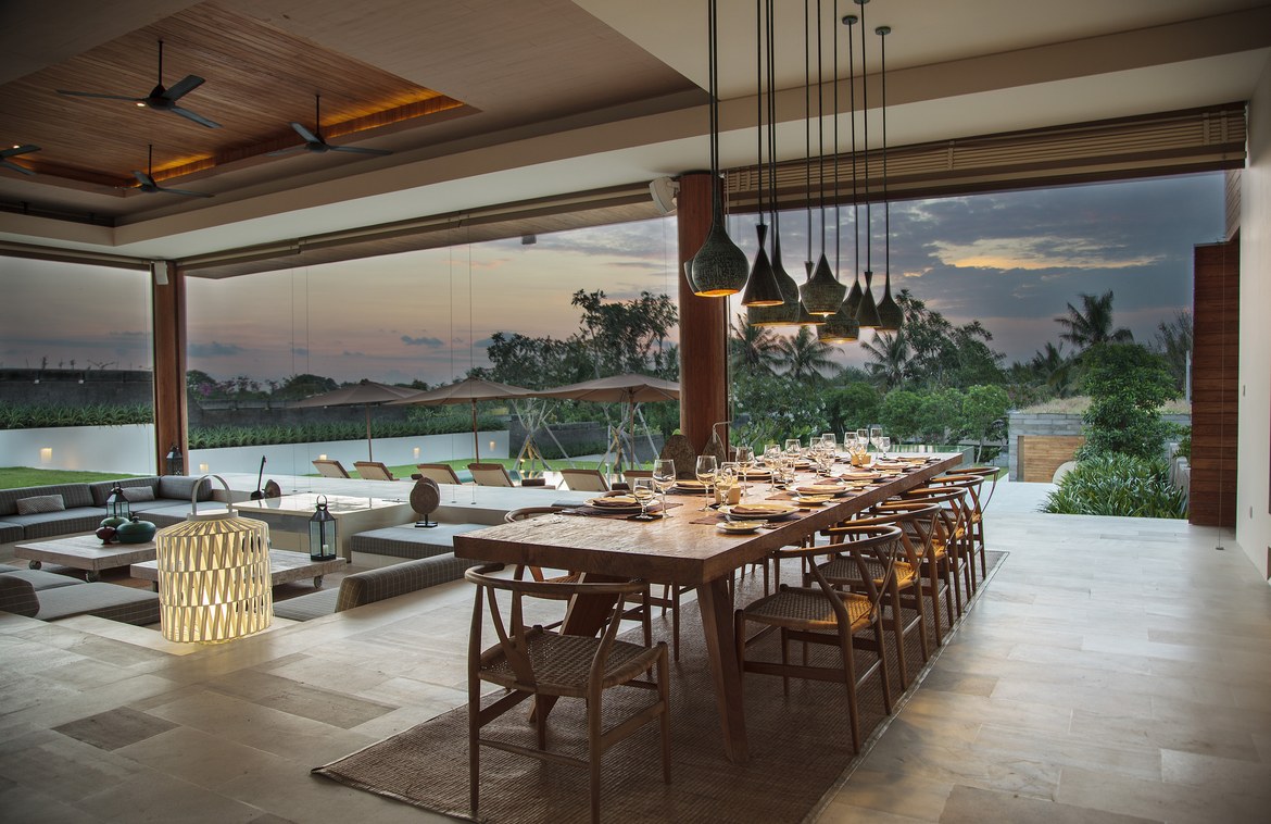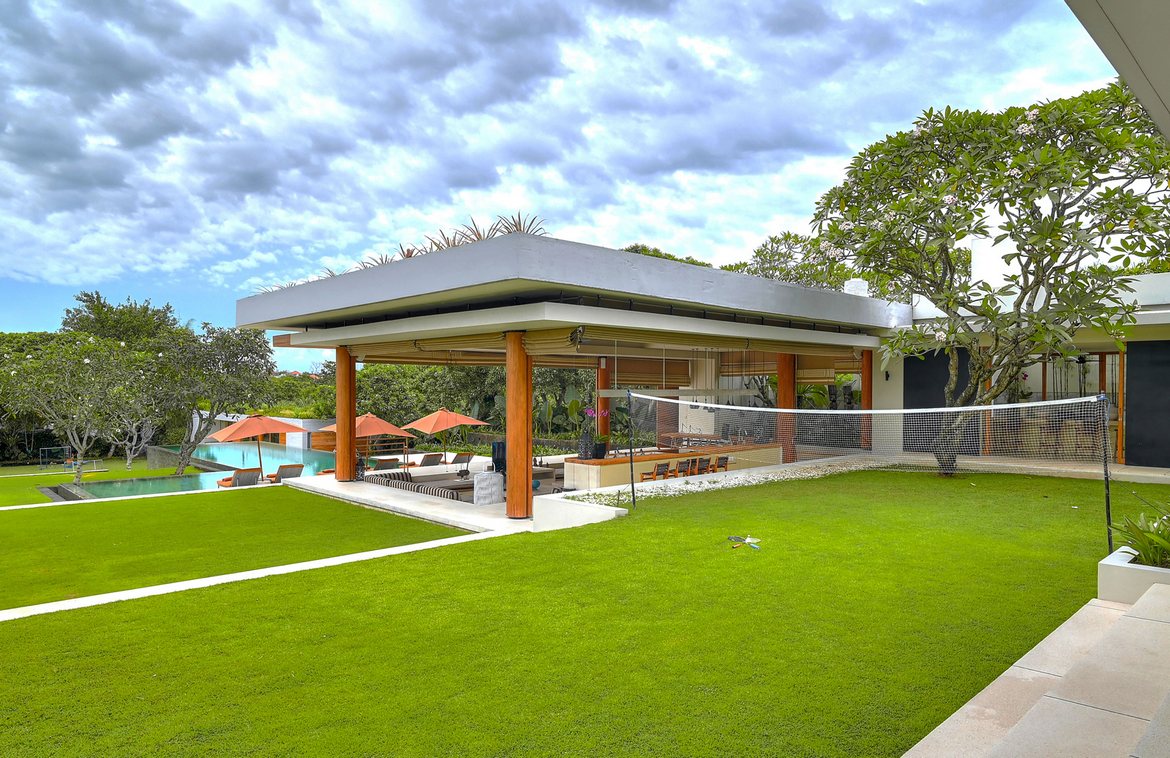 To the right of the entrance is a dedicated wing housing the guest and staff kitchens. At the heart of the property is the open-sided living pavilion with its decadent sunken lounge—an inviting social hub. Adjacent is a 12-seat dining area, both overlooking the 20-meter infinity pool and wading pool. A separate two-bedroom guesthouse with a large multi purpose room is set on a lower garden terrace, offering privacy and flexibility.
