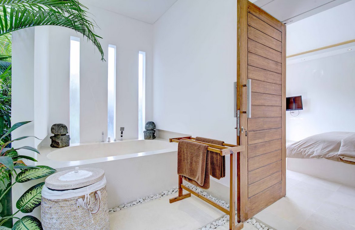 Two master bedrooms are positioned lengthwise along the pool, each offering generous proportions and direct pool views. Both en-suite bathrooms are fitted with built-in bathtubs and enhanced by semi-outdoor showers, adding a resort-style touch to everyday comfort.