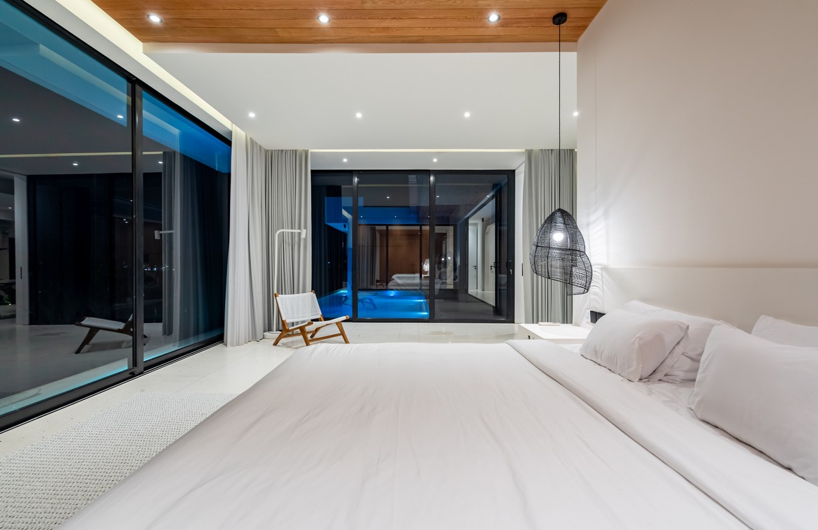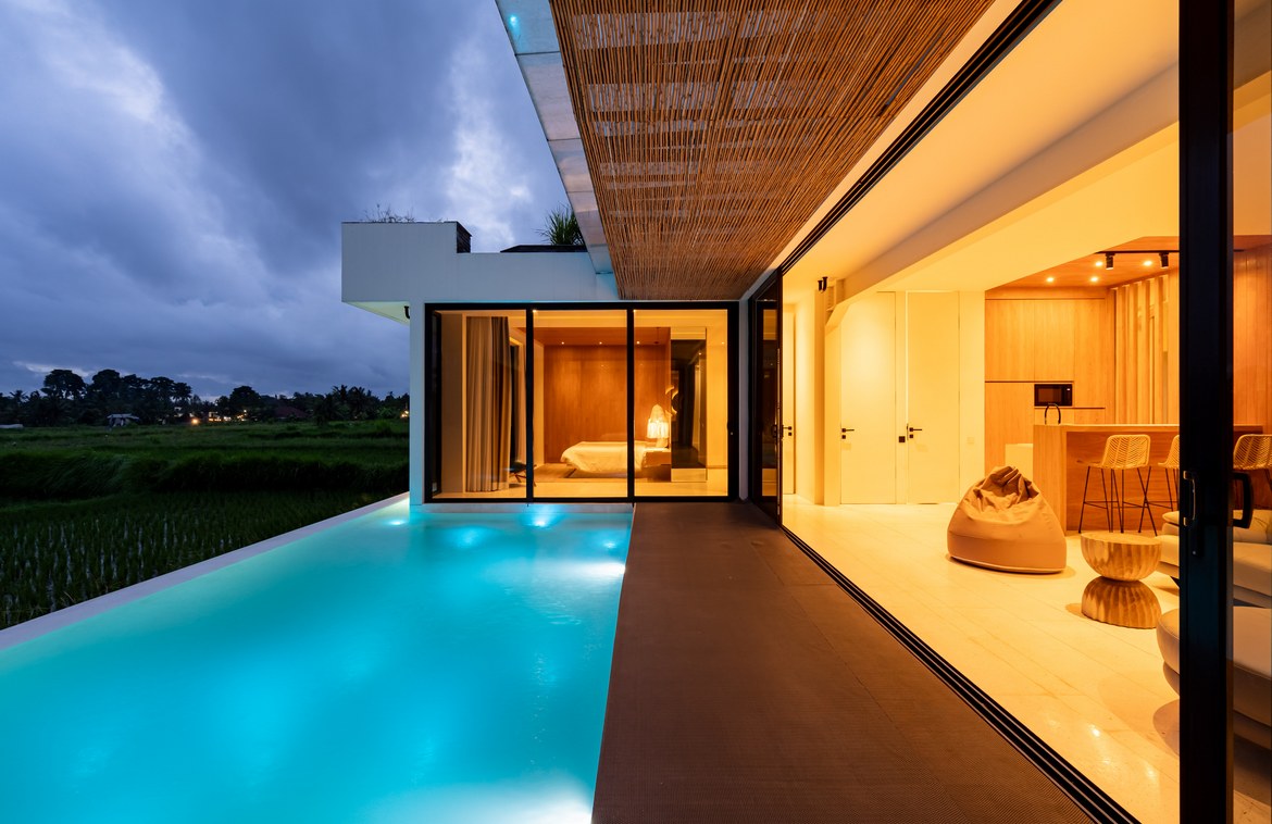 A 10 × 3 meter swimming pool stretches along the outdoor deck, positioned to capture wide views of rice fields and mountain silhouettes. The property includes two bedrooms, both with en-suite bathrooms; the master suite is fitted with a bathtub, while the guest room features a modern shower.