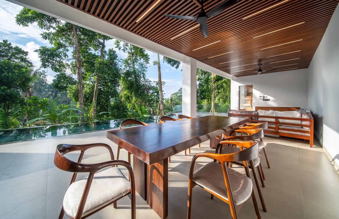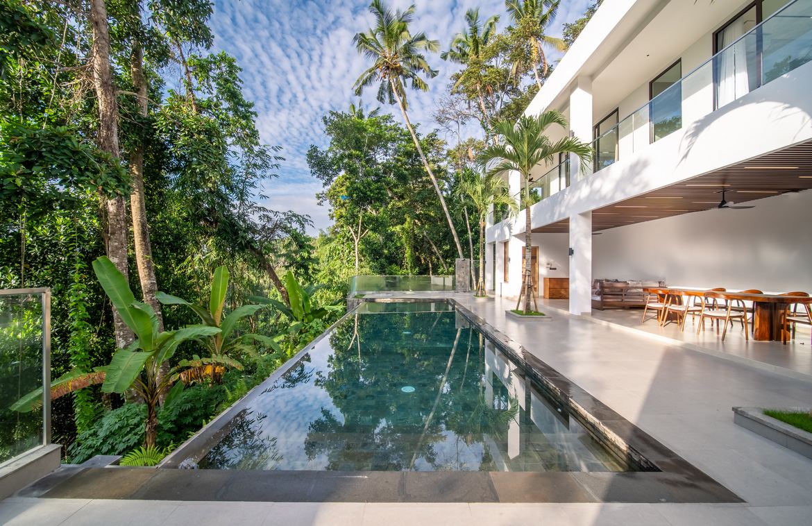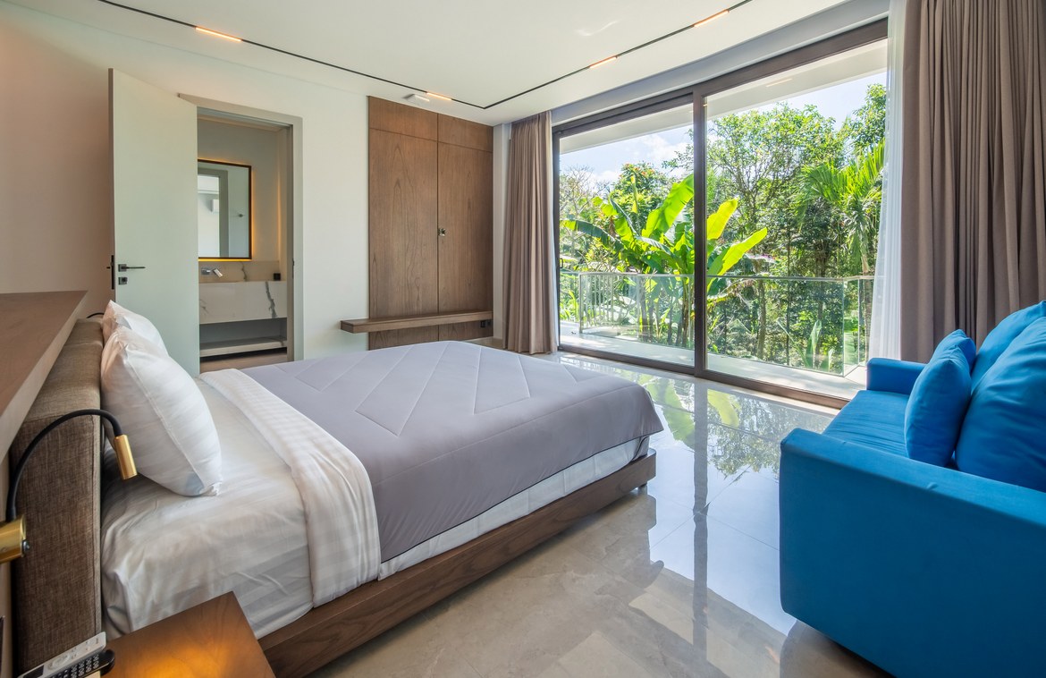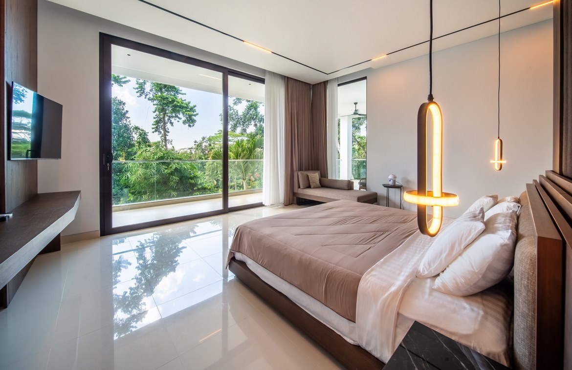 Each bedroom comes with a built-in wardrobe, an en-suite bathroom, and picturesque views of either the pool or the jungle. The master suite is a true retreat, featuring a walk-in wardrobe, a dedicated workspace, and a luxurious en-suite bathroom with a bathtub.