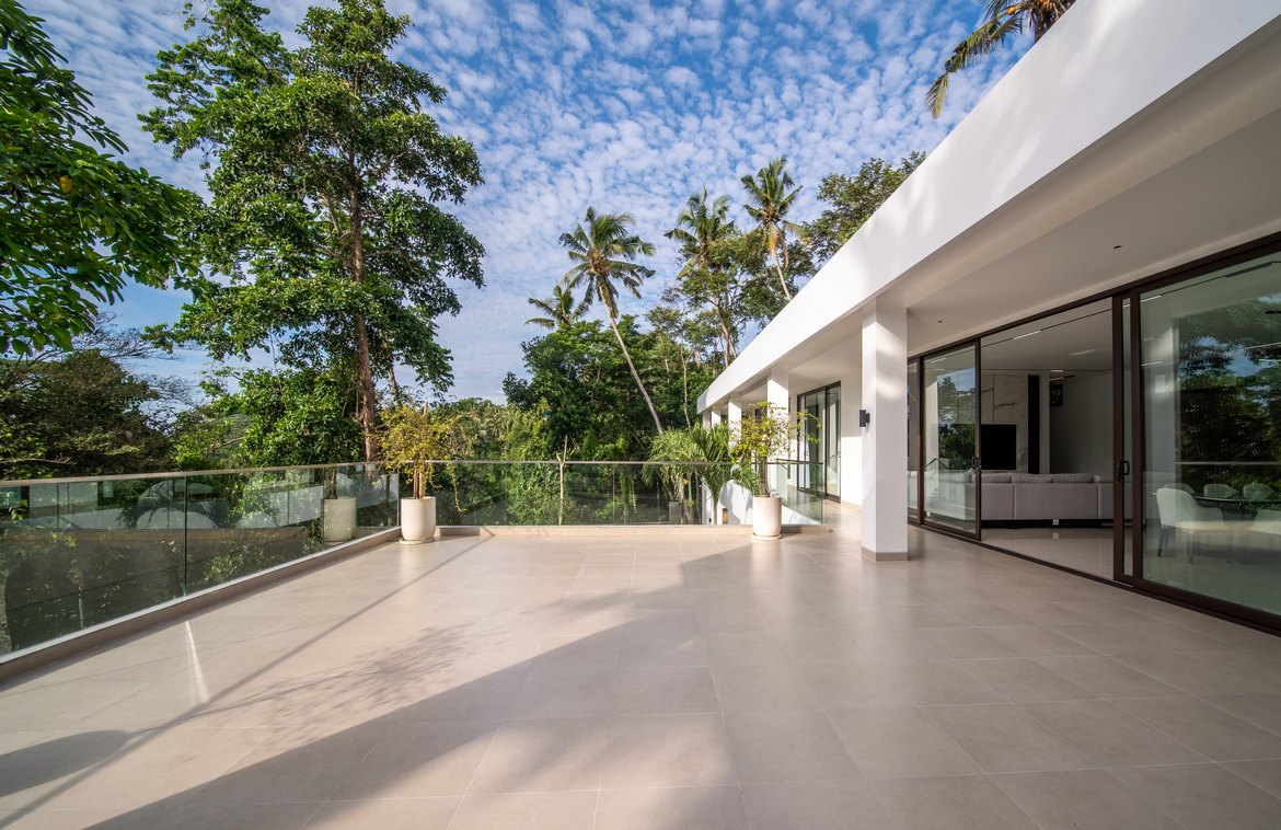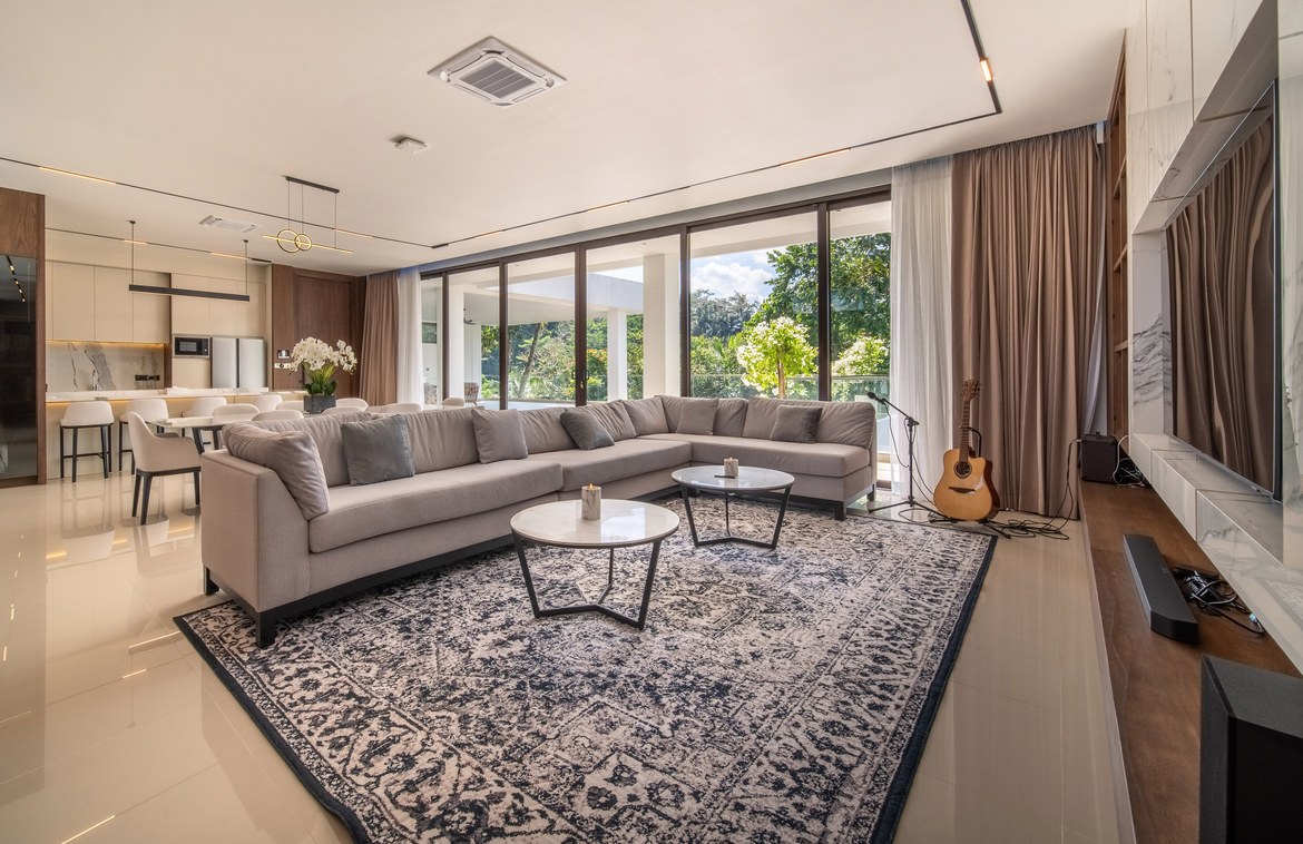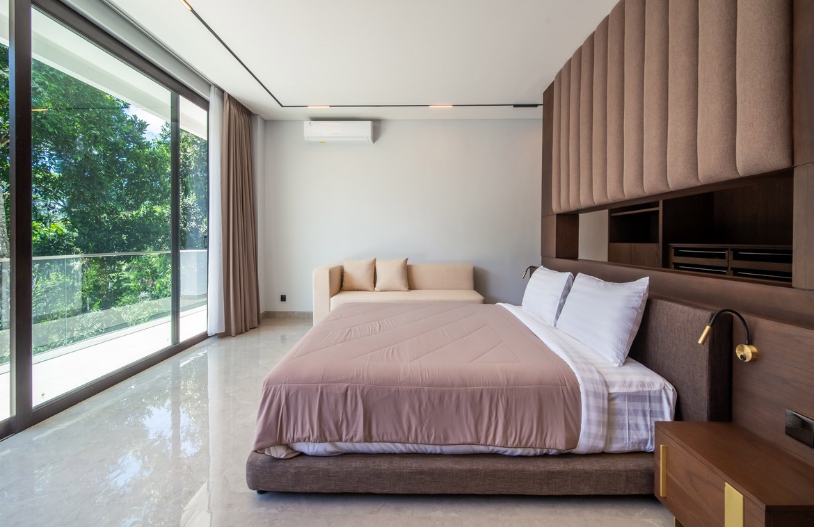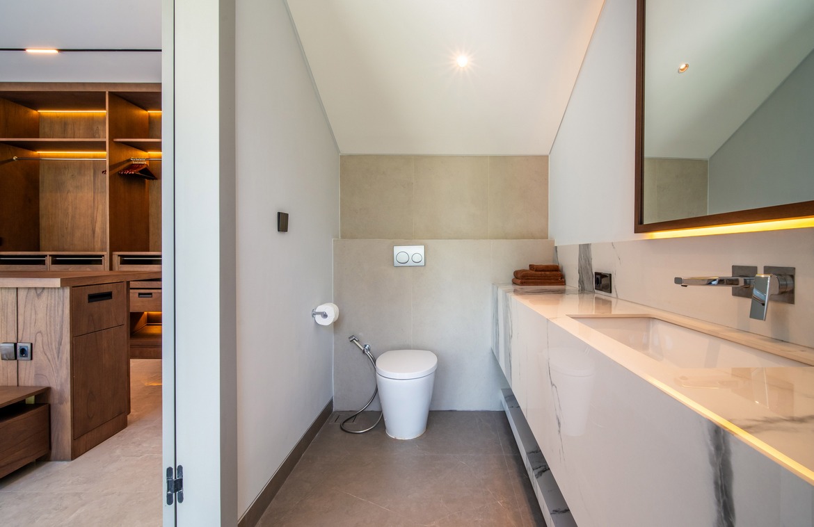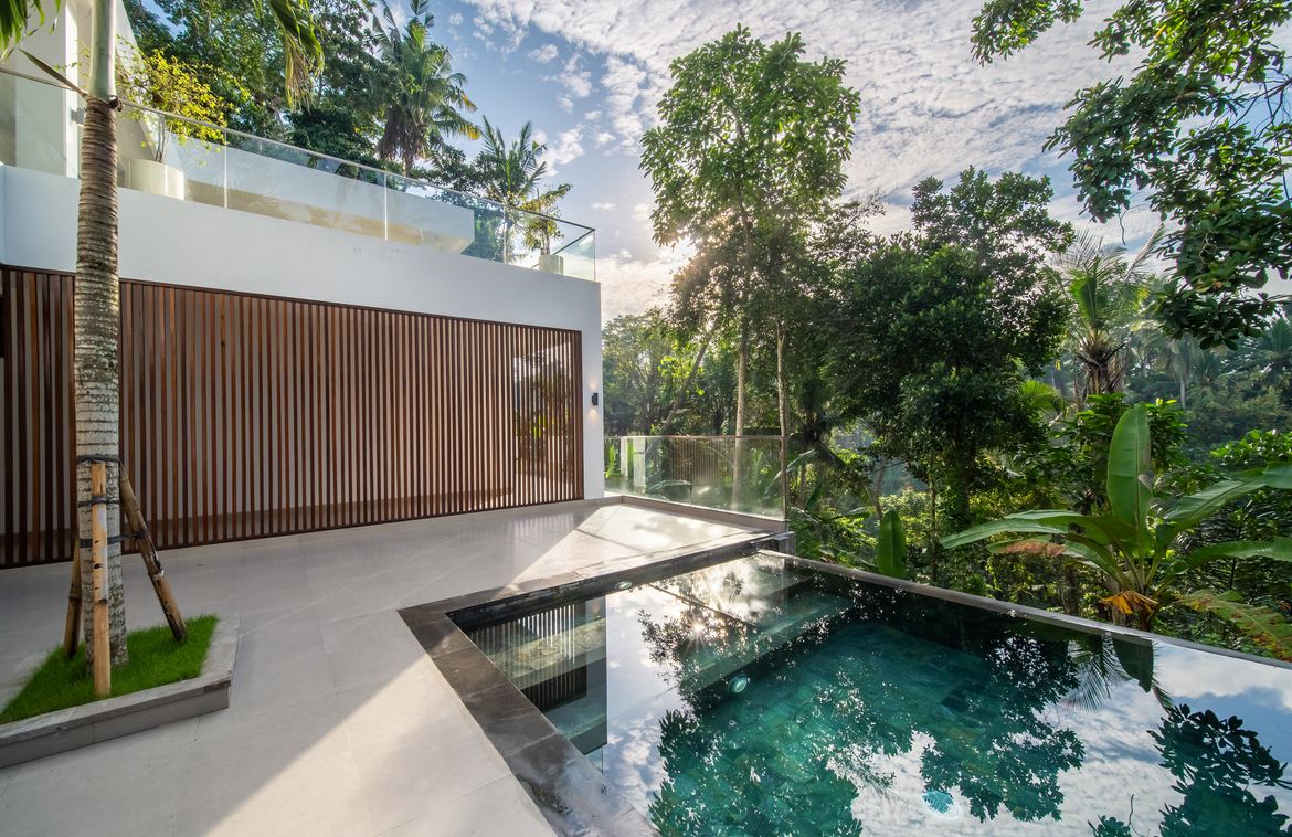 Each bedroom comes with a built-in wardrobe, an en-suite bathroom, and picturesque views of either the pool or the jungle. The master suite is a true retreat, featuring a walk-in wardrobe, a dedicated workspace, and a luxurious en-suite bathroom with a bathtub.