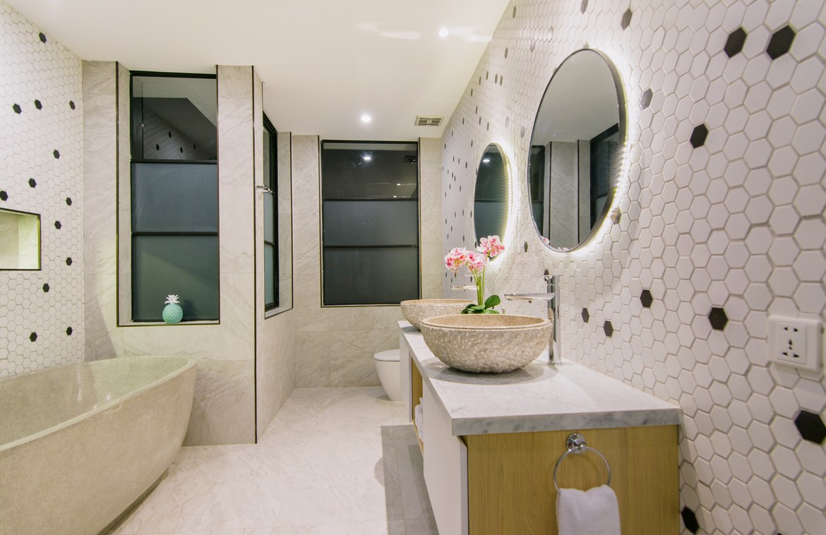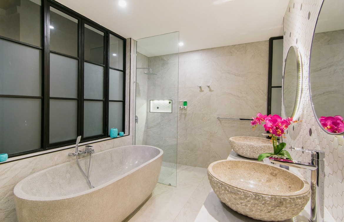 The first bedroom is located adjacent to the living area and enjoys direct access to the pool. Its en-suite bathroom includes double vanity and a semi-open bathtub.