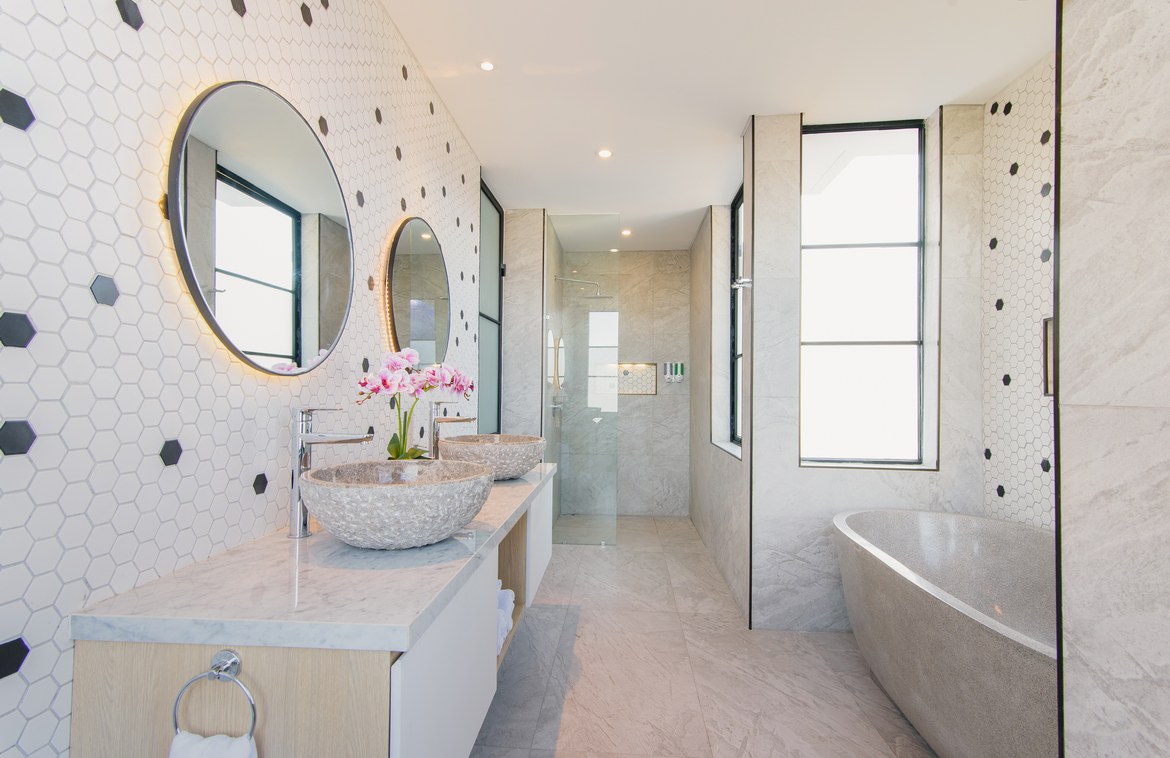 Upstairs are three further generous en-suite bedrooms, each with double vanity and bathtub.