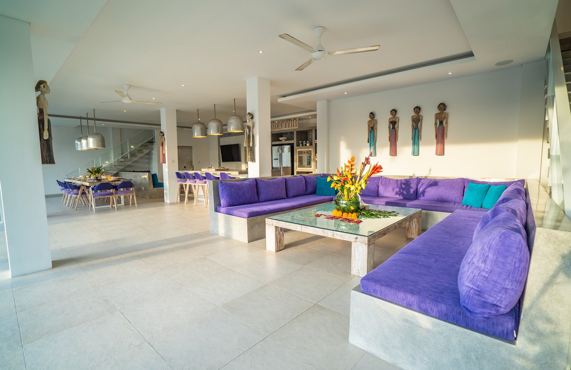 The villa features 4 oversized en-suite bedrooms, each designed as a private junior suite with custom king-size beds, lounge areas, dressing rooms, and spacious bathrooms. The open-plan living and dining area is bright and airy, complete with multiple lounge spaces, a fully equipped designer kitchen, and elegant finishes throughout.