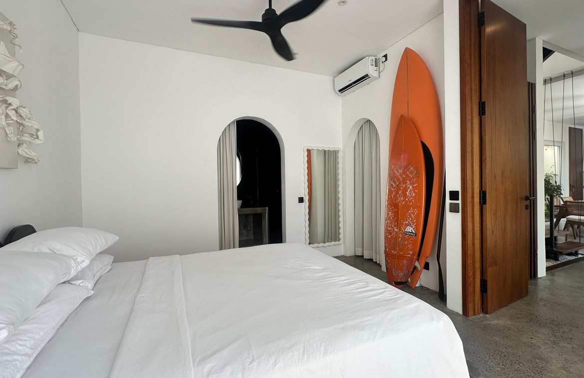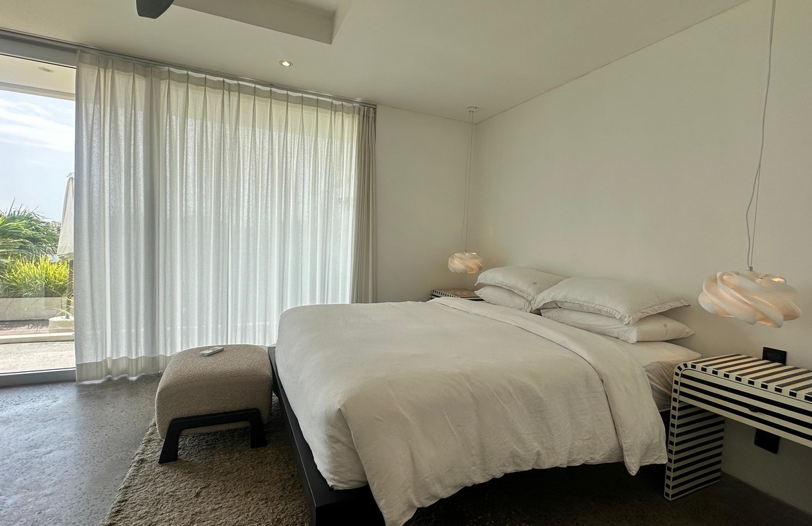 The first bedroom is conveniently located on the ground floor with direct pool access, and comes with a walk-in wardrobe and an en-suite bathroom with an indoor shower. Upstairs, the master bedroom and third bedroom share access to a balcony that leads to a spacious rooftop terrace overlooking the pool and garden — an ideal spot for afternoon relaxation, complete with its own outdoor lounge seating and a separate sunset viewing deck. The master suite is generously sized, featuring a comfortable sofa, large walk-in wardrobe, and an elegant en-suite bathroom with a stunning bathtub. The third bedroom is equally spacious and includes its own en-suite with an indoor shower.