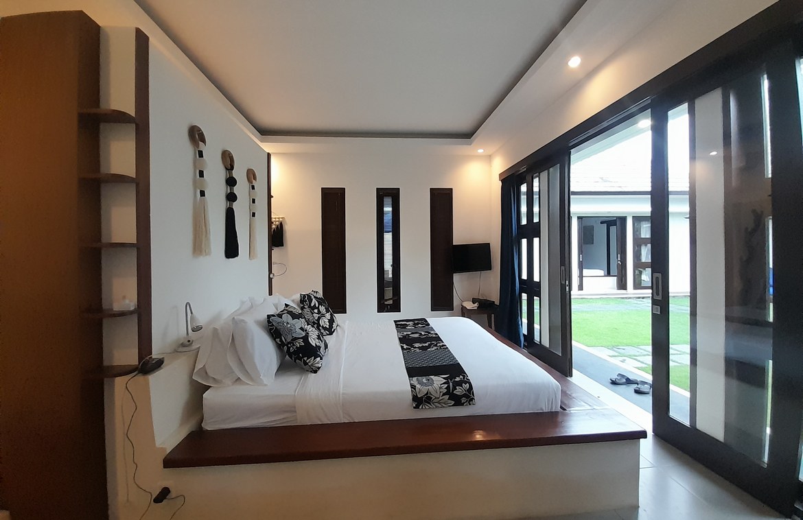 Occupying 500 sqm of land, the villa spans 200 sqm of living space, thoughtfully laid out across three single-level pavilions arranged in a graceful U-shape around a 12.5 x 5-meter private pool. The lush tropical garden, wooden sundeck with loungers, and a serene bale bengong at the heart of the pool area create an inviting sanctuary for relaxation and outdoor living. A charming alfresco dining terrace overlooks the manicured lawn and garden—ideal for morning coffee or intimate dinners under the stars.