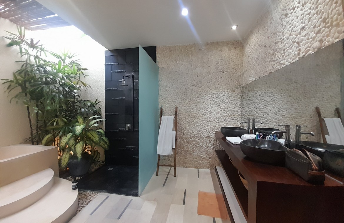 The main pavilion hosts an airy enclosed living and dining area with a sleek modern kitchen and peninsula counter. The second pavilion accommodates two guest bedrooms, each with built-in wardrobes and semi-open en-suite bathrooms. The master suite, set in its own private pavilion, features a generous layout with a bathtub and a tranquil semi-open bathroom, evoking a spa-like atmosphere.